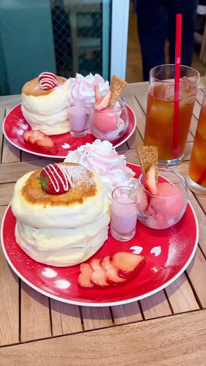 東京都北千住駅近くにあるお店「茶香」の、ホワイトチョコがけのふわっふわのパンケーキの横にたっぷりのエスプーマ、いちごソルベ&いちごマスカルポーネを合わせた3月限定「Good luckパンケーキ」(動画ver)✨