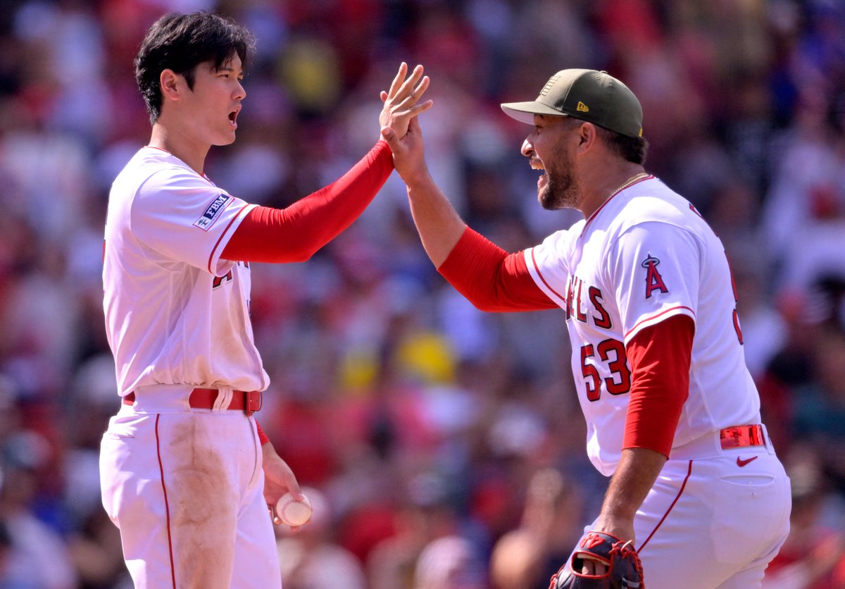 6回1失点と好投した #エンゼルス #大谷翔平 投手 最後はハイタッチでお出迎え? 守護神エステべス投手も満面の笑みです? 写真:ロイター #ShoheiOhtani #ShoTime #Angels #GoHalos