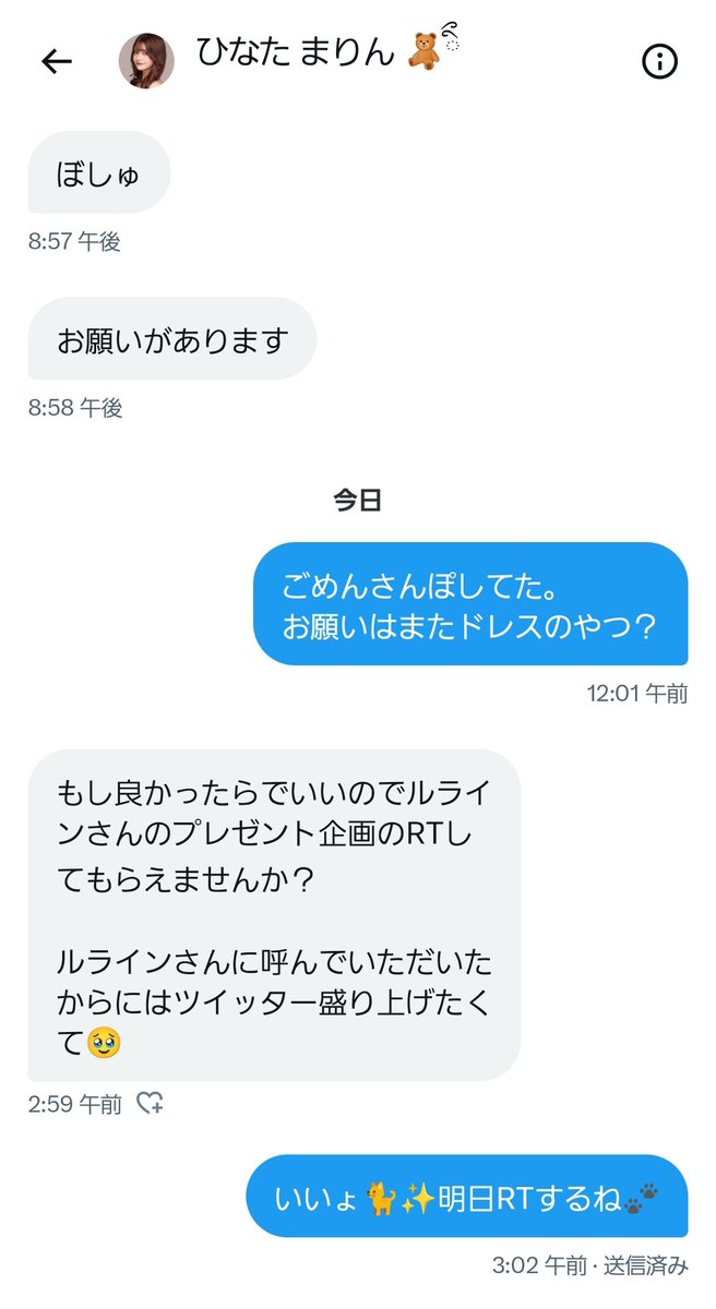 すぐにいいよって言っちゃうの直さないとな。普通は金もらって拡散するのに、女子経由だと無料になるのおかしいだろ。ルラインさん5万くらい俺にくれてもいいょ?️✨