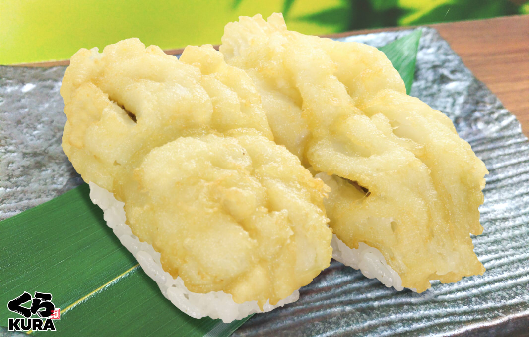 『【愛媛県産】はも天にぎり』? ふわりとやわらかい愛媛県産の「はも 」の身を、 店内で揚げたての天ぷら寿司にしました✨ サクッ、ふわっ、のハーモニーをぜひ味わってください?