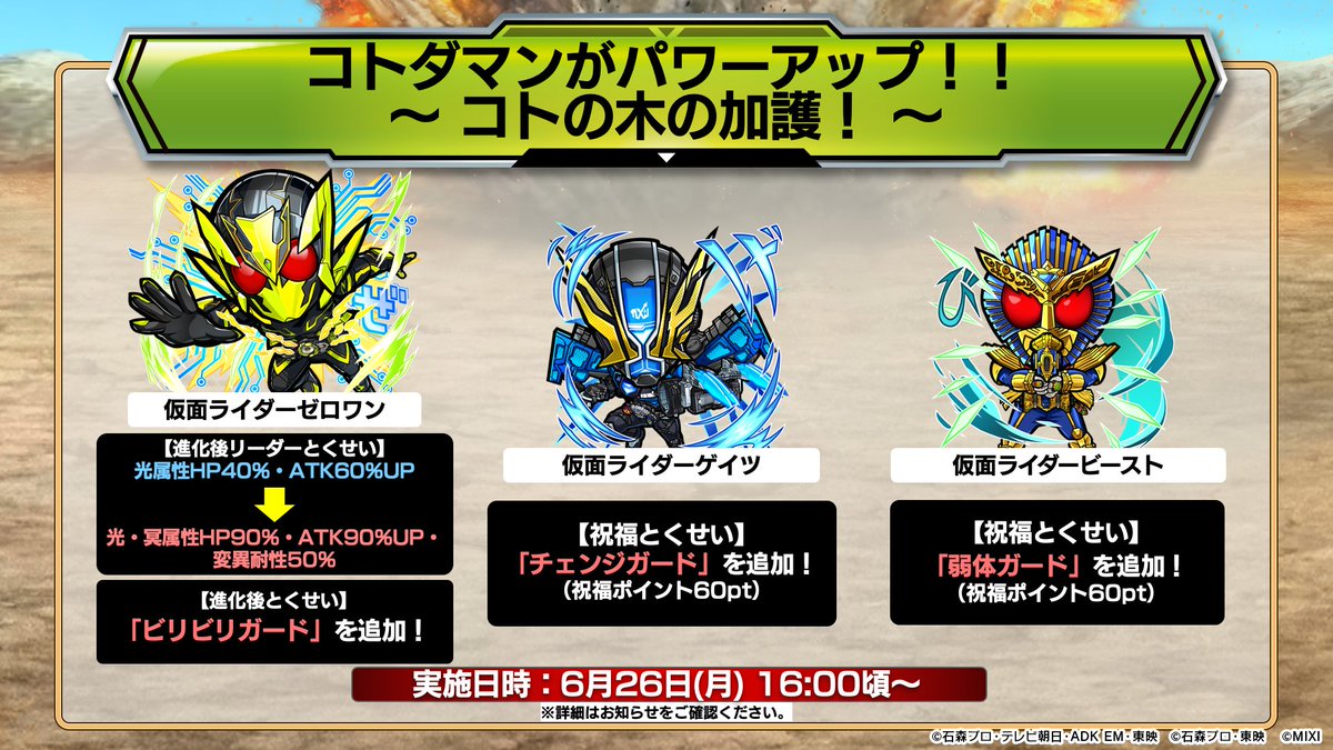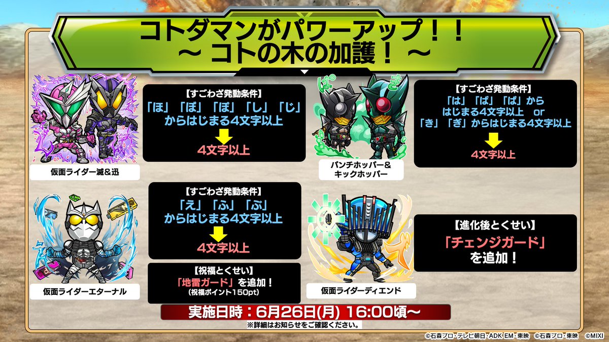 明日6月26日(月)16:00頃から 仮面ライダー×コトダマンコラボ第5弾開催じゃ〜!? 豪華なキャンペーンも開催中! 要チェックじゃぞぃ✨