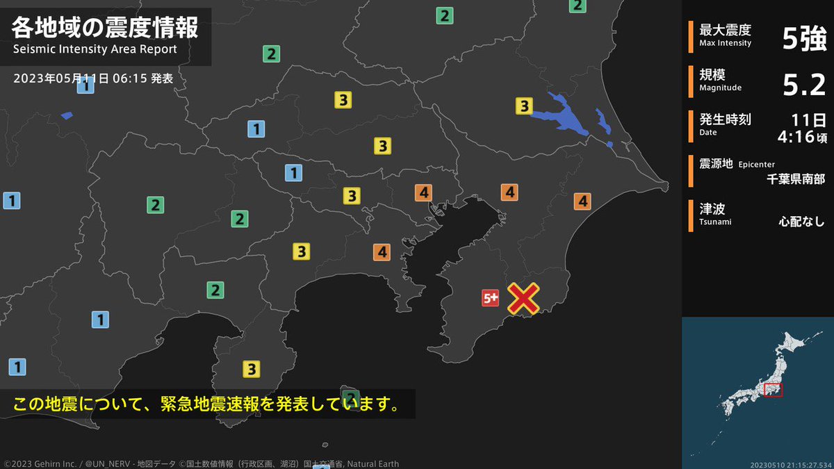 ?音声あり 【地震情報 2023年5月11日】 4時16分頃、千葉県南部を震源とする地震がありました。震源の深さは約40km、地震の規模はM5.4、最大震度5強を千葉県で観測しています。この地震による津波の心配はありません。