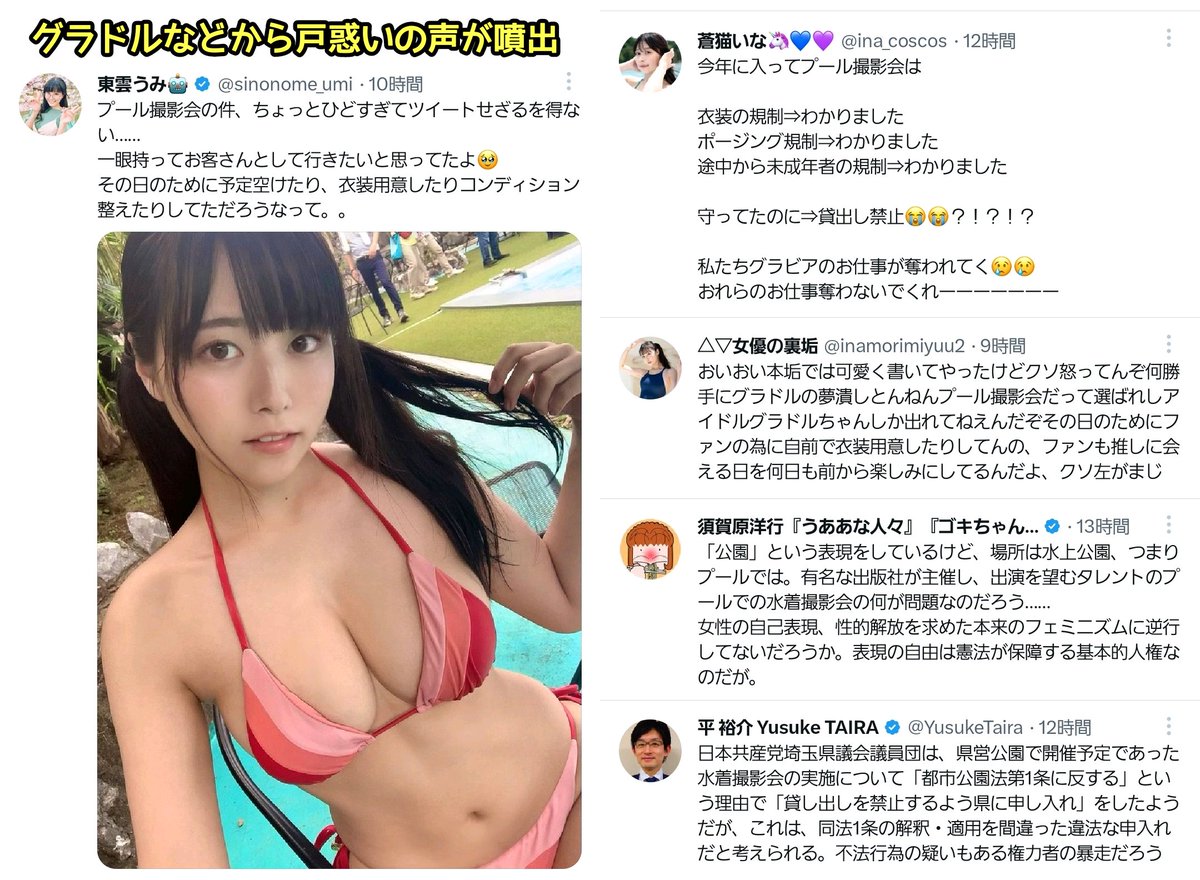 【悲報】日本共産党さん、貸し切りプールで行われるグラドルやコスプレイヤーらの『プール撮影会』に猛抗議 ↓ 実際に撮影会が中止になる事態へ発展 ↓ グラドルや専門家などから戸惑い、批判の声相次ぐ