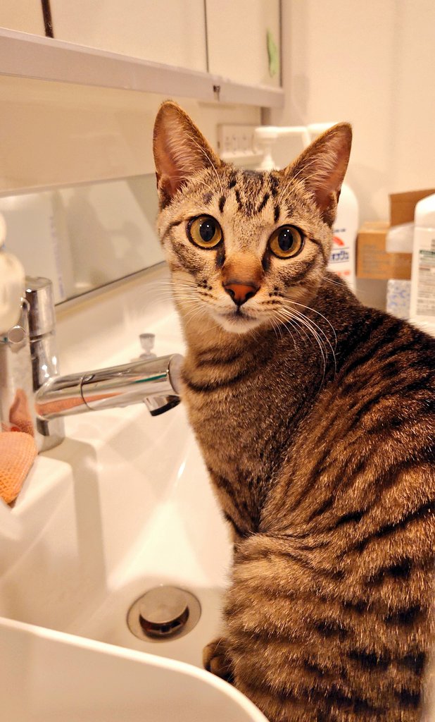 洗面台にはまり込んで満足げなちびすけ。そろそろ寝ますよ? #N機関 #ちびすけ