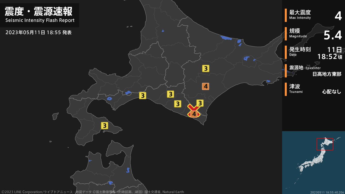 【震度・震源速報 2023年5月11日】 18時52分頃、日高地方東部を震源とする地震がありました。震源の深さは約50km、地震の規模はM5.4と推定されています。この地震による津波の心配はありません。