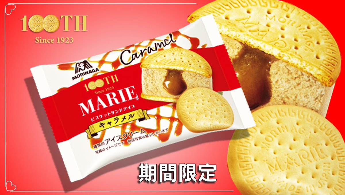 マリービスケット発売100周年を記念して 期間限定で、マリービスケットサンドアイスが新発売! キャラメル味のアイスクリームの中にとろ~りキャラメルソース入り❤ これがマリービスケットと相性抜群なんです! ぜひお楽しみくださいね♪