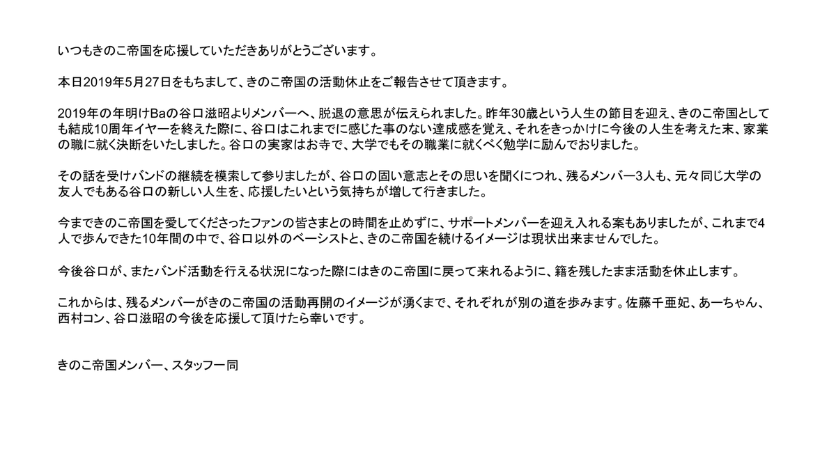 きのこ帝国からファンの皆様へ大切なお知らせ
