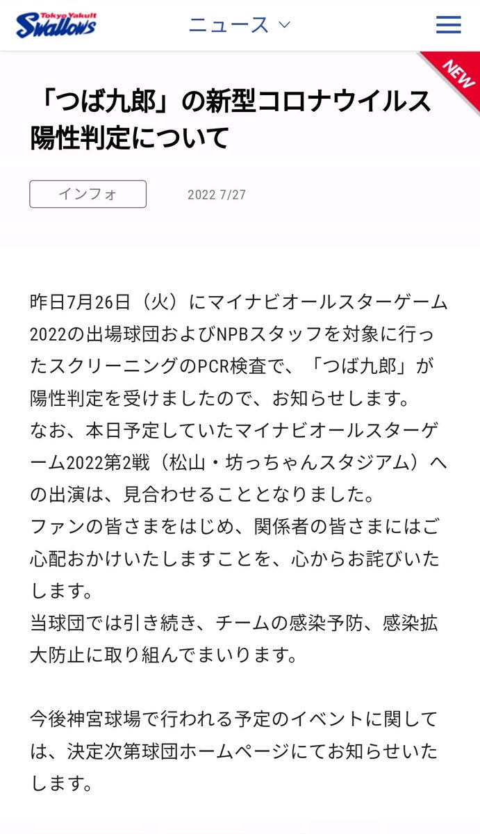 ヤクルト「つば九郎」コロナ陽性 日本ハムでは4人