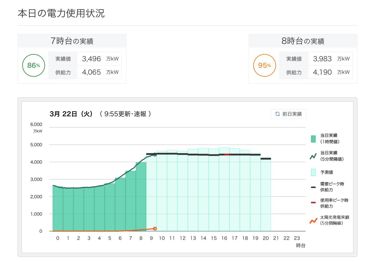【お知らせ】3月22日(火曜日)は、電力の需給が非常に厳しい状況です。節電のご協力をお願いいたします。 最新の電力需給見通しはこちら↓ 東京電力パワーグリッド「でんき予報」