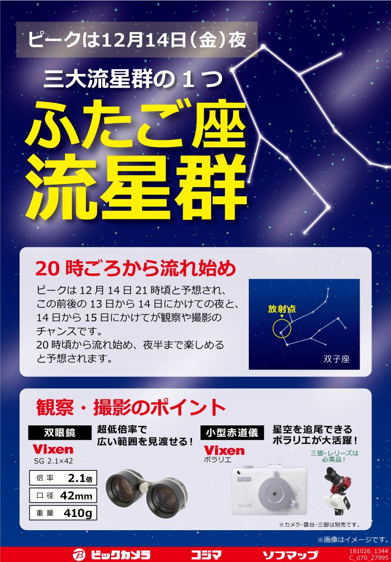 夜空で開催? ホットな天体イベント #ふたご座流星群 12月14日(金)が見ごろ? ぜひ、ご参考に^^ ビックカメラ