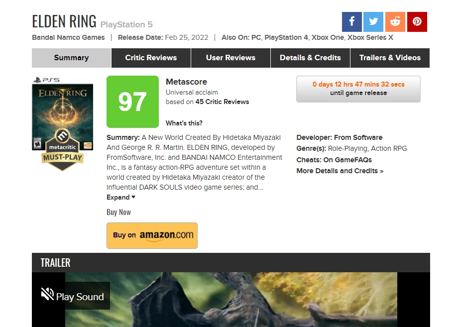 『ELDEN RING』(エルデンリング)、各海外メディアによるレビューを平均化した「メタスコア」でほぼ満点に近い“97点”を獲得