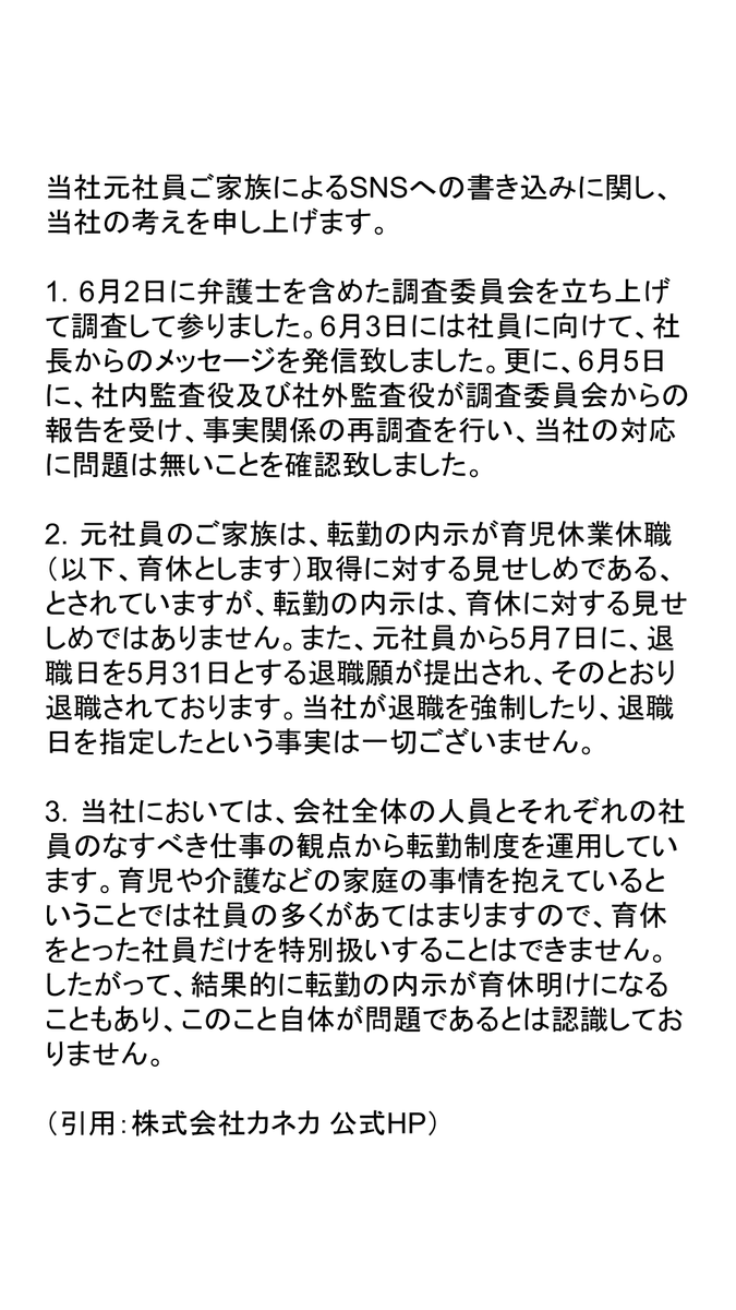 育休復帰、即転勤で炎上中のカネカ。同社の角倉護社長は社員に向けたメールで転勤内示の事実を認めた。全文を公開する。 #カガクでネガイをカナエル会社 #カネカ #育休 #育児休暇 #転勤 #内部メール #日経ビジネス