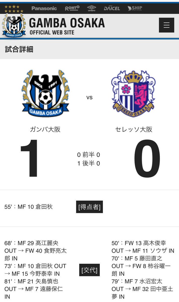 \??白熱の #大阪ダービー はG大阪に軍配?⚫/ #ガンバ大阪 1-0 #セレッソ大阪 ■得点者 G大阪:#倉田秋(55分) ダービー4連勝???? リーグ8試合ぶり勝利で最下位脱出 詳細?
