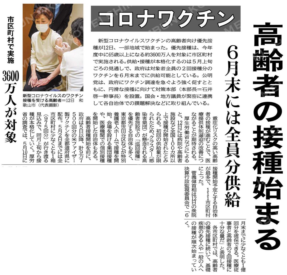 (#コロナワクチン)高齢者の接種始まる/6月末には全員分供給/市区町村で実施、3600万人が対象 #公明新聞電子版 2021年04月13日付