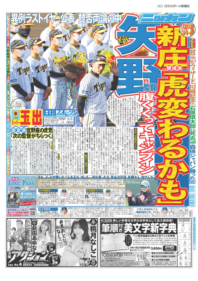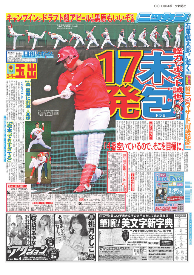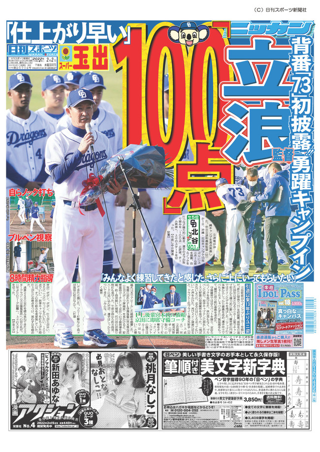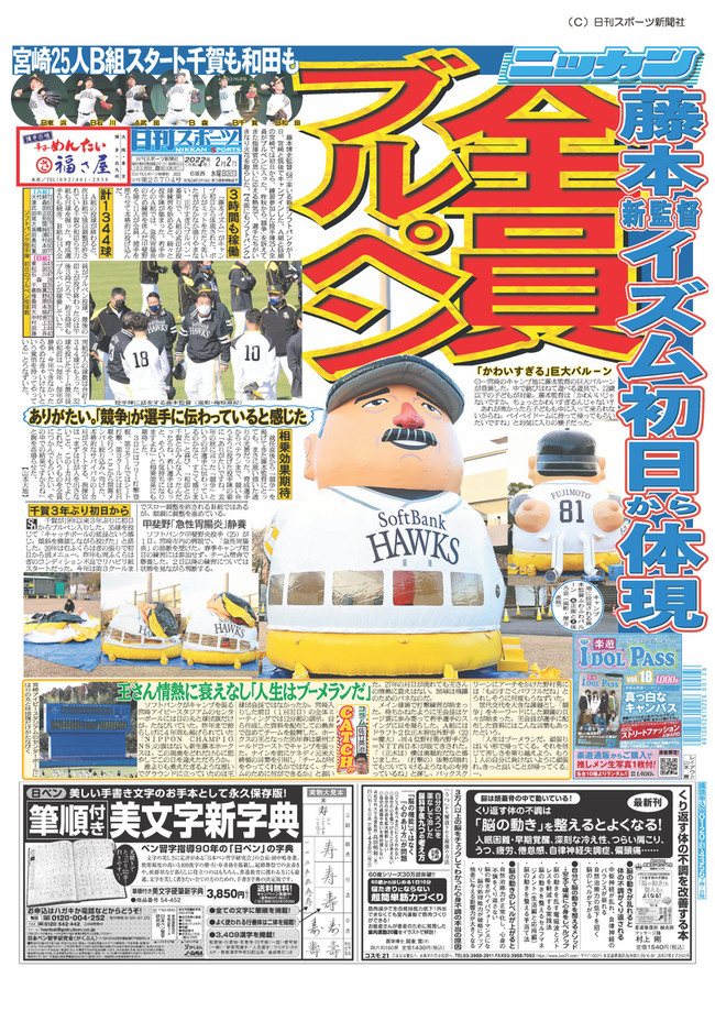 <2月2日:日刊スポーツ1面> 首都圏 サッカー日本代表 北海道 サッカー日本代表 名古屋 中日立浪監督100点 大 阪 阪神矢野監督 広 島 広島末包17発 九 州 ソフトバンク全員ブルペン