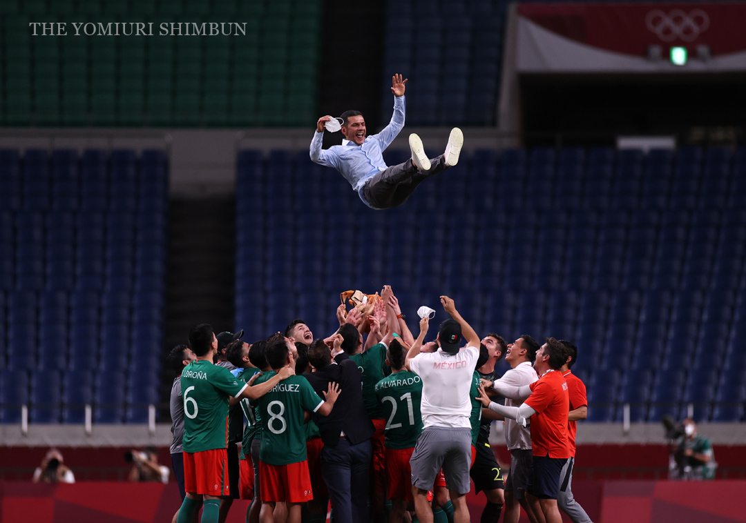 #東京五輪 ・サッカー 男子の3位決定戦で日本に勝利し、胴上げされるメキシコのロサノ監督。その高さに驚きました(三浦) #サッカー日本代表 #胴上げ #T