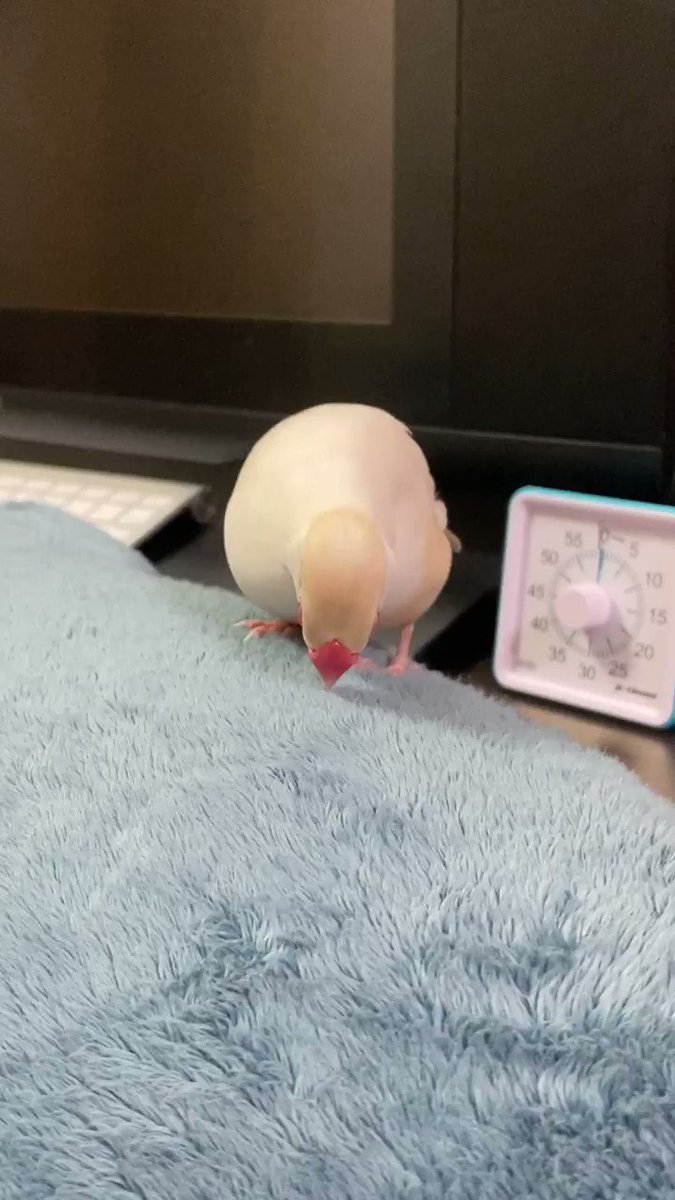 IKEAのサメの上でご機嫌なステップを踏む文鳥
