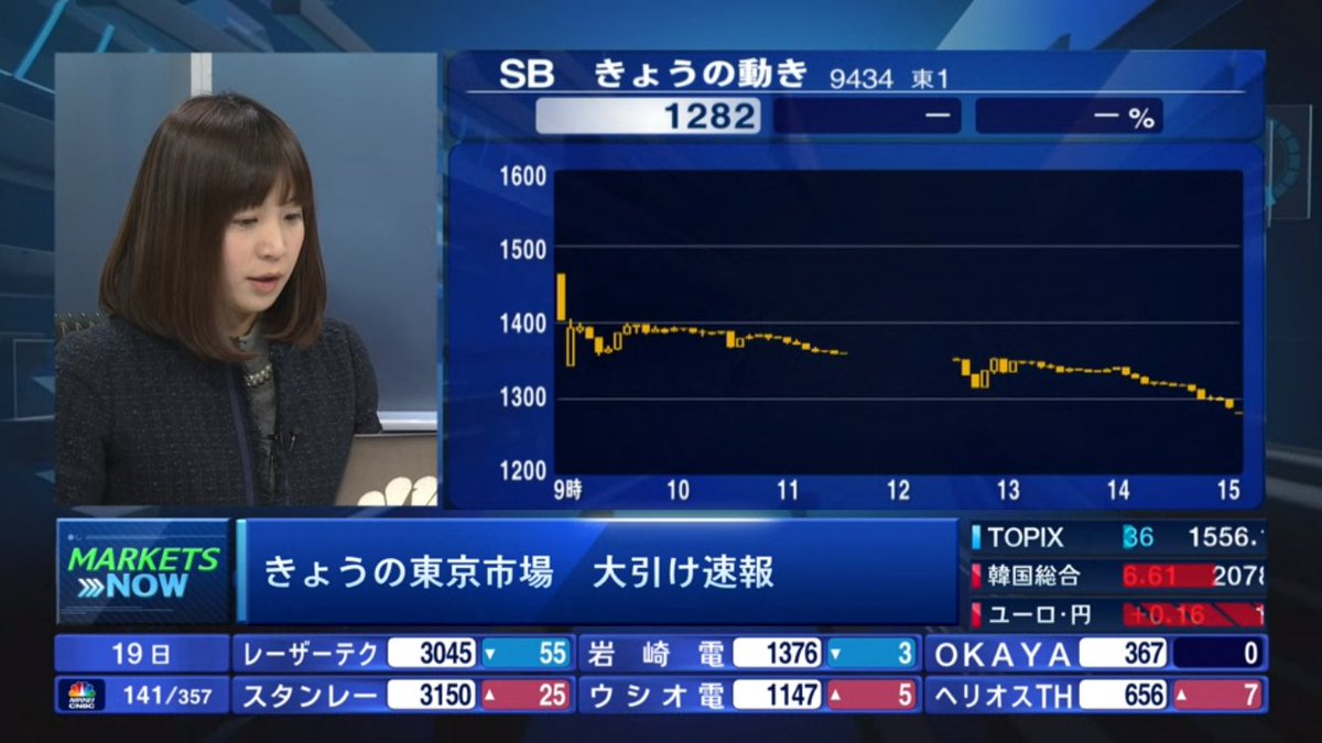 【ソフトバンク(9434)】上場初日の終値は1282円。公開価格比218円安、初値比181円安でした。ライブ視聴は→