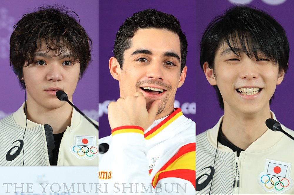 #フィギュア スケート男子SPを終え、記者会見に臨む(左から)3位の #宇野昌磨、2位のスペイン #ハビエル・フェルナンデス、1位の #羽生結弦 ら、各選手。表情も三人三様で、面白いですね(16日、若杉和希撮影)