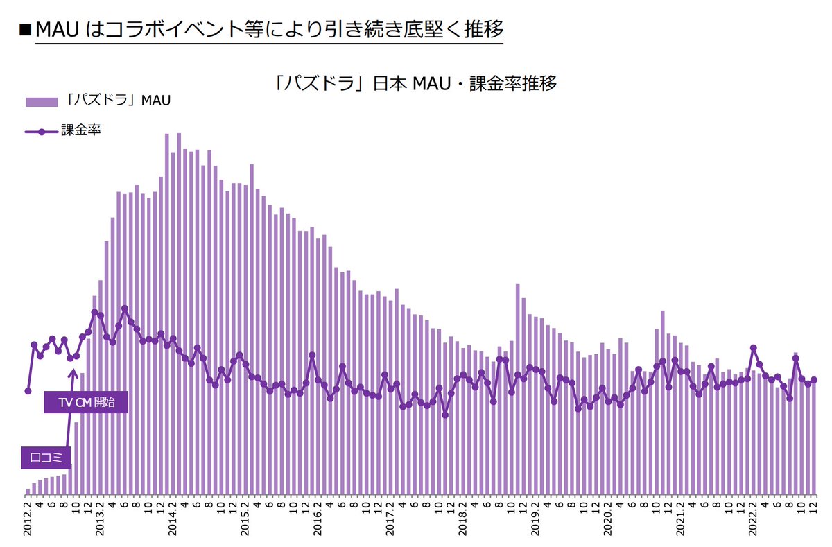 ピークは過ぎたが 完全に衰退する時が来るのだろうかと思うくらいの 「パズドラ」の日本国内におけるMAU・課金率の推移
