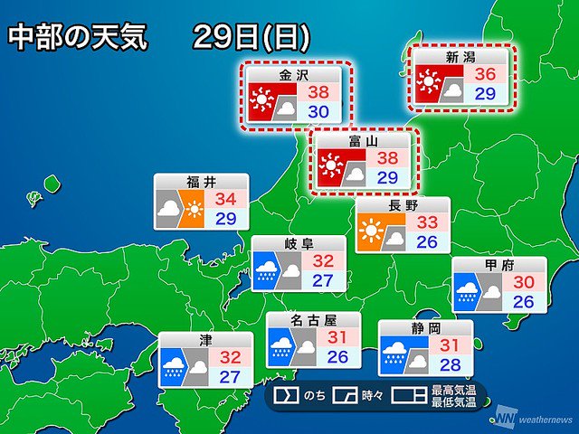 【29日(日) 台風12号の影響で北陸は40℃近い猛暑】 29日(日)の北陸は台風12号の影響で強い南風が吹き、「フェーン現象」で気温が上昇します。40℃近い猛暑になるところもあり、熱中症に警戒が必要です。…