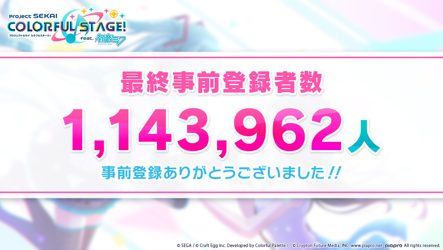 『プロジェクトセカイ』 最終事前登録者数は1,143,962人? 事前登録ありがとうございました✨ 本日よりサービス開始した「プロジェクトセカイ」をお楽しみください☺️‼️ #初音ミク #プロセカ