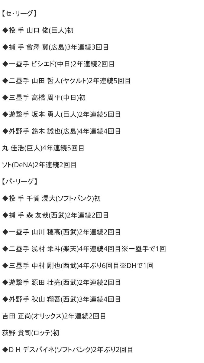 巨人山口、中日高橋が初受賞/セ・ベストナイン一覧 #ベストナイン
