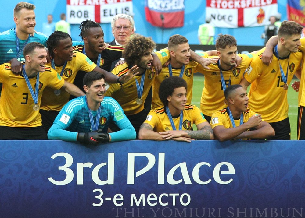 < #ロシアW杯 #3位決定戦 >イングランドを2対1で破り3位となり、喜ぶベルギーチーム(14日、ロシア・サンクトペテルブルグで)=宇那木健一撮影