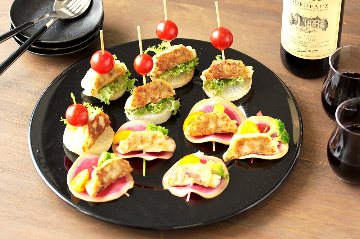 おはようございます☀ 今日は #ボジョレーヌーボー 解禁日?✨ 餃子をちょっとオシャレにアレンジして、ワインのおつまみにいかがですか? それでは本日もよろしくお願いいたします! #マルシンフーズ #宇都宮餃子シリーズ