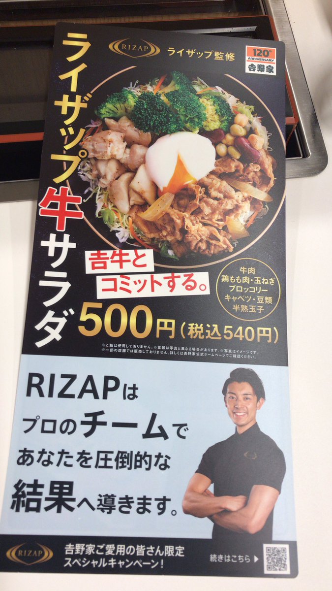 \?RIZAP×吉野家【初】共同開発新メニュー?/ 結果にコミットするライザップと吉野家が共同開発した新商品。 「ライザップ牛サラダ」が明日から発売✨ 吉野家【史上初】牛丼のご飯の代わりにサラダ❗ 高たんぱく質、低糖質を実現❗…