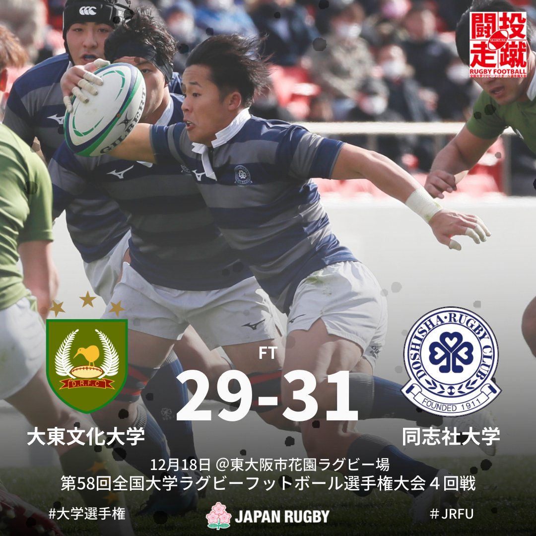 第58回全国大学ラグビーフットボール選手権大会4回戦? 東大阪市花園ラグビー場? 試合結果 大東文化大学 29 -31 同志社大学 #大学選手権 @UnivRugbyJP