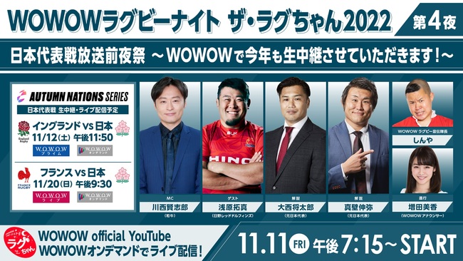 ⚡このあと配信スタート⚡ / #WOWOW ラグビーナイト? ザ・ #ラグちゃん2022 第4夜 ?日本代表戦放送前夜祭 ✨今年も生中継させていただきます❗️ \ ?このあと午後7