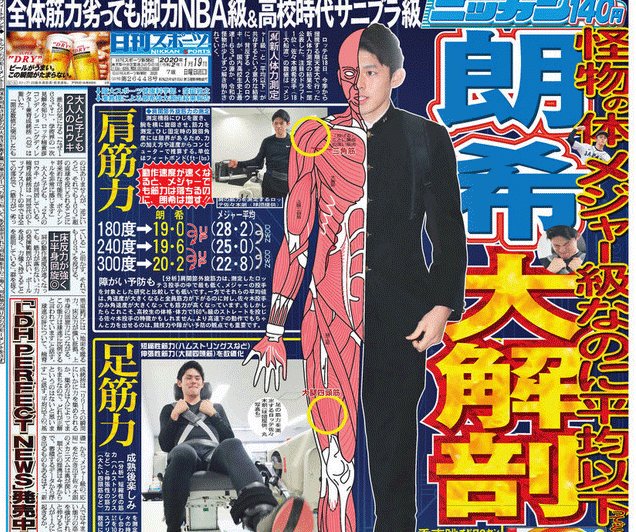 19日の日刊スポーツ首都圏版1面はロッテ佐々木朗希投手 群抜く跳躍力と凡庸な肩筋力「2人の朗希」大解剖