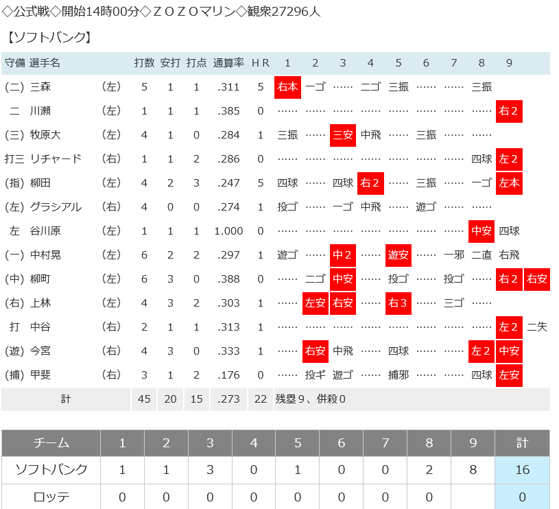 ソフトバンク16-0ロッテ(終了) ※ソフトバンクは20安打で16点。大関がプロ初完投初完封で3勝目