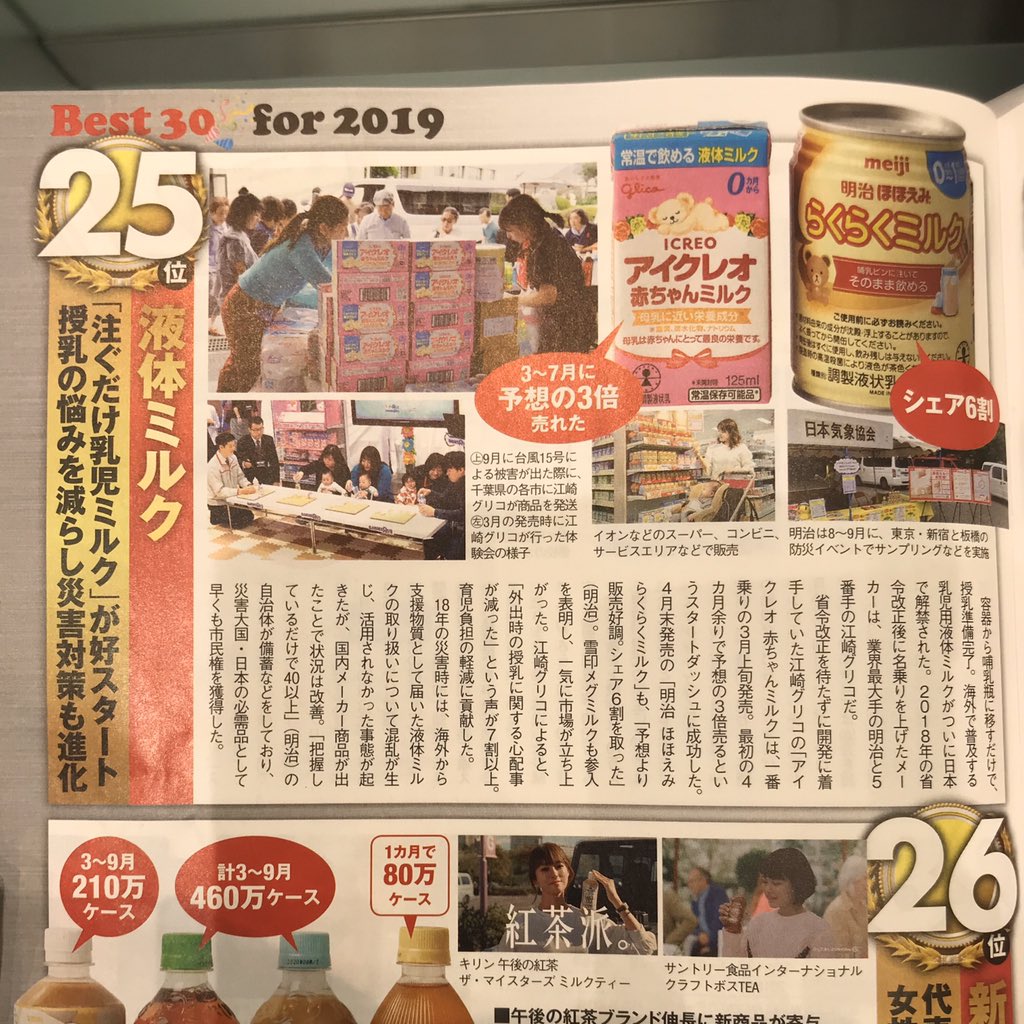 おっ、液体ミルクが「2019ヒット商品ベスト30」に入っていた。1位ワークマン、2位タピオカ、3位PayPay…