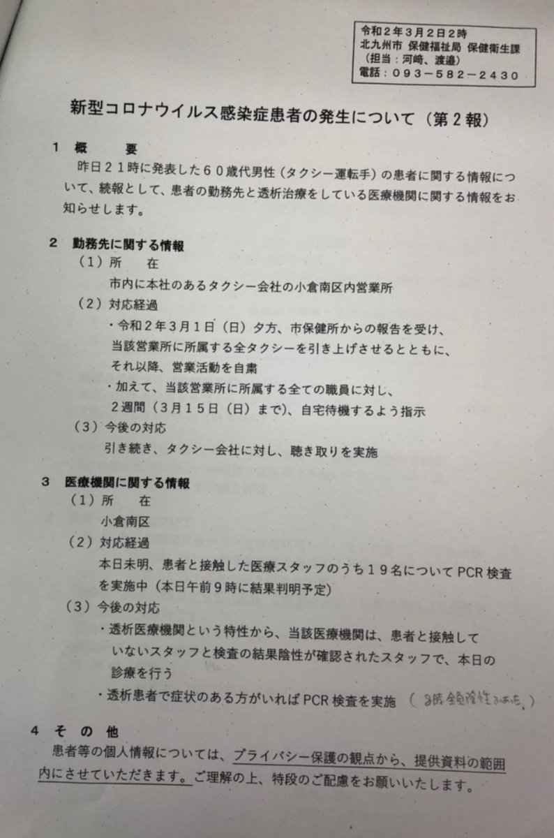 新型コロナウイルス感染、北九州市での一例目確認との速報。 詳しい情報を引き続き確認して必要な対応をします。。 皆さんは感染防止対策の徹底(手洗い、うがい、咳エチケット)をお願いします。 必要な手だては国にも訴えます。