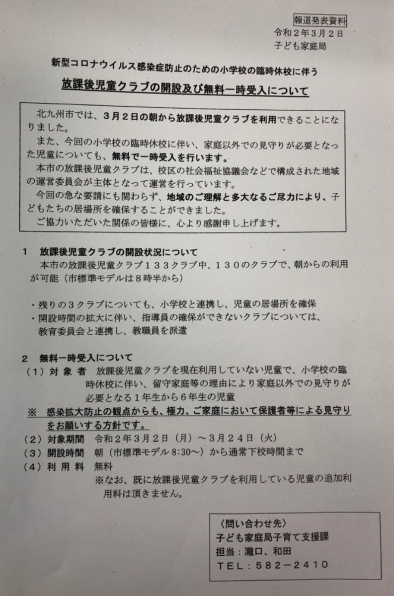 新型コロナウイルス感染者北九州市の状況と小学校臨時休校に伴う放課後児童クラブの開設及び無料一時受け入れについて、をシェアします。