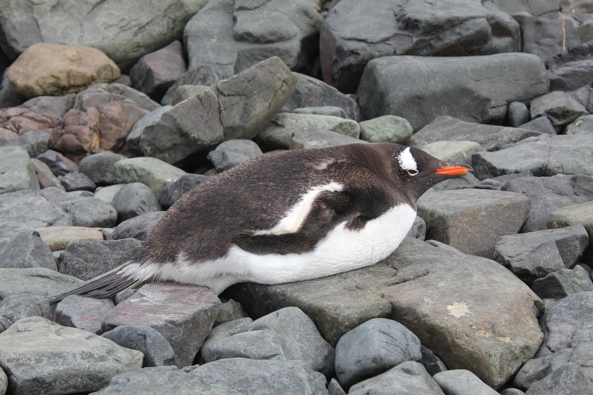 基地の目の前にある海辺を歩いていると、 ペンギンのなかまに出くわします。 南極へ来たことを実感する瞬間です。 写真は海岸で横たわるジェンツーペンギンです。 #かさりん #