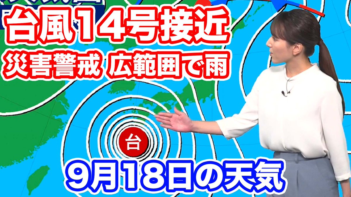 【9月18日(日)の天気】台風14号が九州に接近し暴風雨に。中国・四国地方から関東にかけても雨や風の強まります。 ▼台風情報はアプリ「ウェザーニュース」でチェック