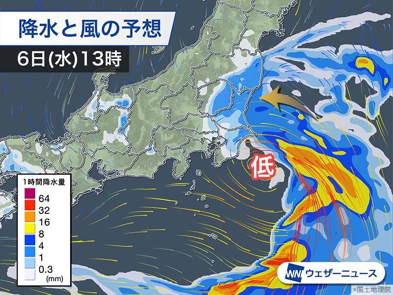 <関東、午後は雨の範囲拡大も> 台風4号から変わった低気圧は関東の沖を進んでいます。この周囲を吹く東寄りの風の影響で雨雲が発生しており、午後は雨の範囲が広がる見込みです。