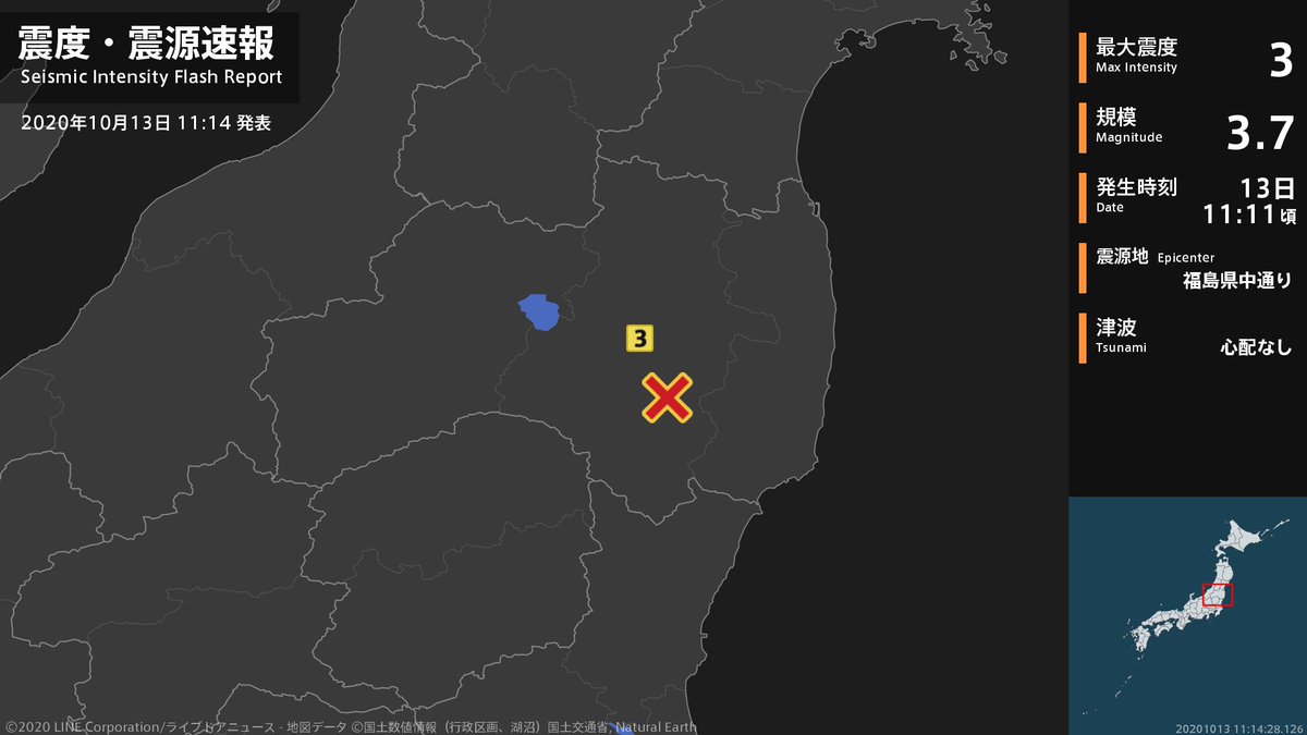 【震度・震源速報 2020年10月13日】 11時11分頃、福島県中通りを震源とする地震がありました。震源の深さは約10km、地震の規模はM3