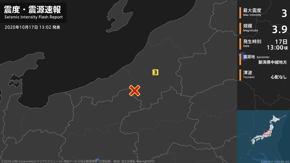 【震度・震源速報 2020年10月17日】 13時0分頃、新潟県中越地方を震源とする地震がありました。震源の深さは約10km、地震の規模はM3