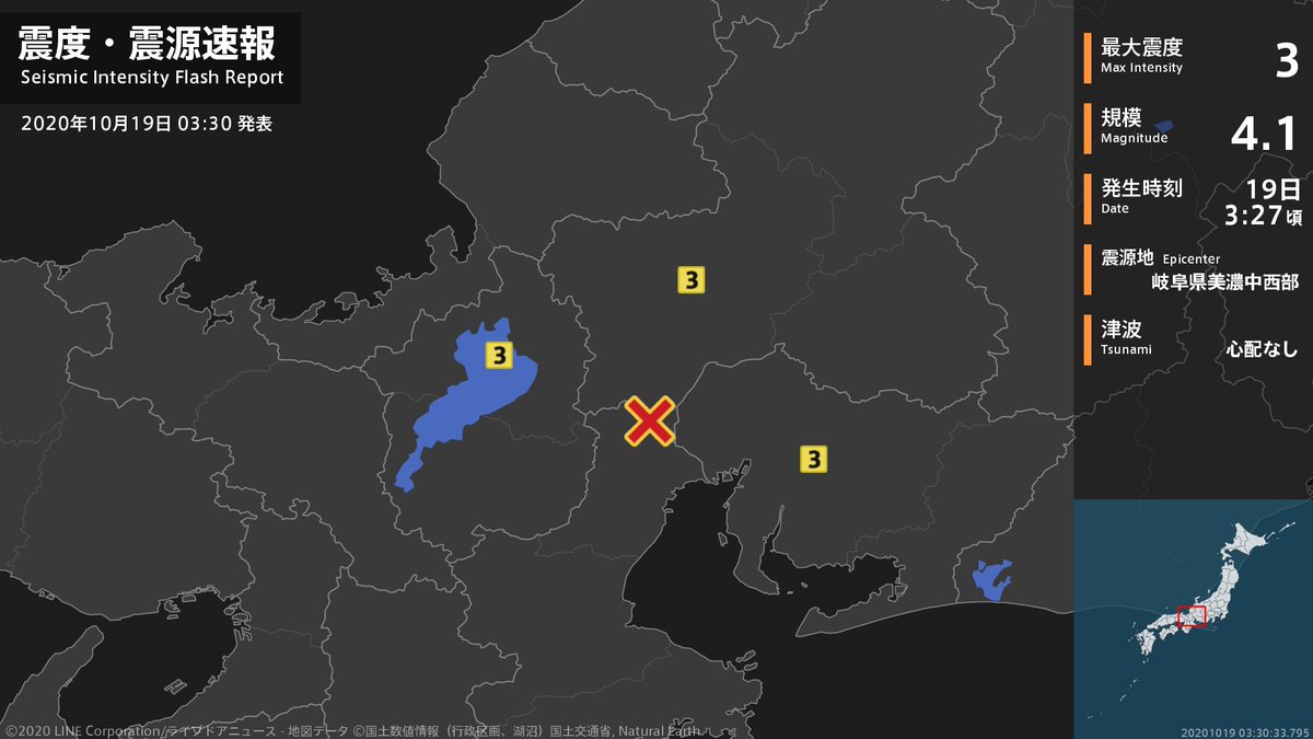 【震度・震源速報 2020年10月19日】 3時27分頃、岐阜県美濃中西部を震源とする地震がありました。震源の深さは約40km、地震の規模はM4