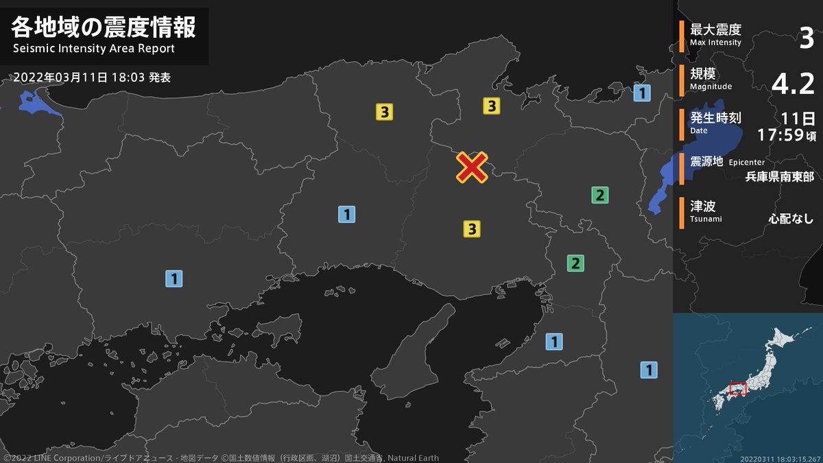 【地震情報 2022年3月11日】 17時59分頃、兵庫県南東部を震源とする地震がありました。震源の深さはごく浅い、地震の規模はM4