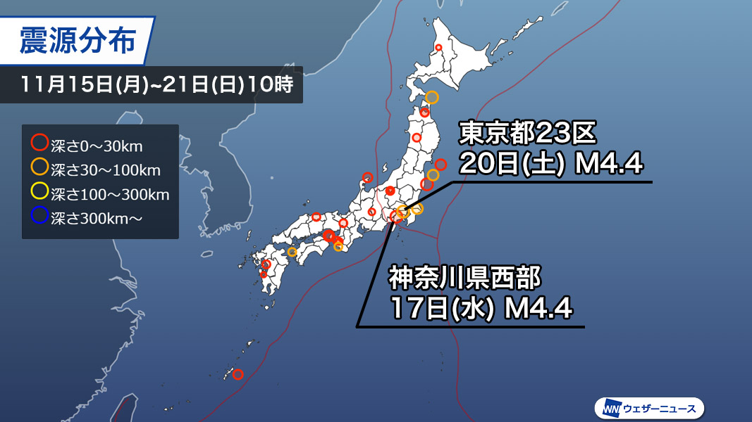 【地震情報 2021年11月20日】 8時57分頃、東京都23区を震源とする地震がありました。震源の深さは約100km、地震の規模はM4