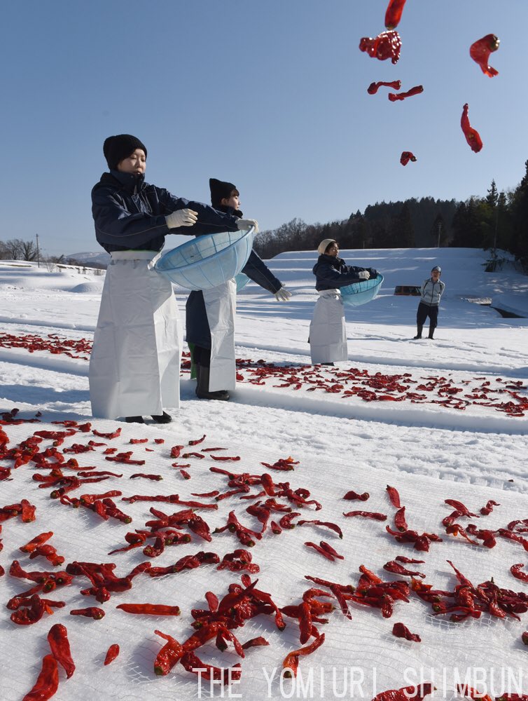 二十四節気の「大寒」を迎えた20日、新潟県妙高市では、塩漬けした唐辛子を雪上にさらす「かんずり」作りが始まりました。寒さが緩んだ日中に広がった青空の下、真っ白な雪に撒かれた唐辛子の赤が映えています(寛爺) #かんずり #妙高 #大寒