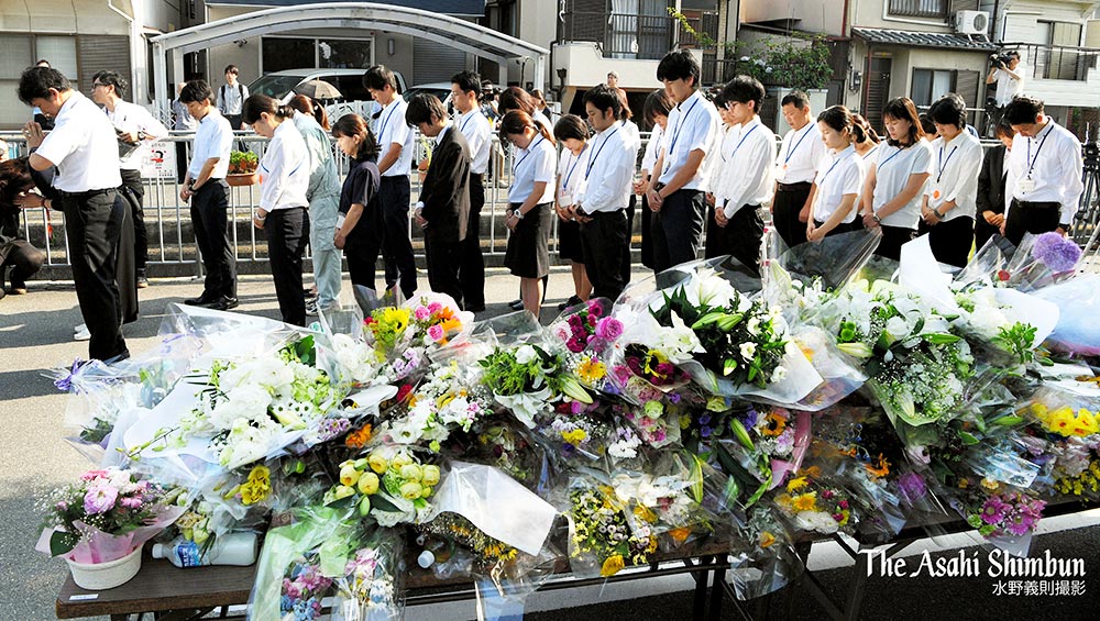 #大阪北部地震 から1週間。地震発生時刻の午前7時58分、倒壊したブロック塀の犠牲になった女の子が通っていた高槻市立 #寿永小学校 では、教職員らが献花台の前で #黙禱 を捧げました。(細)#高槻市 #地震 #大阪地震