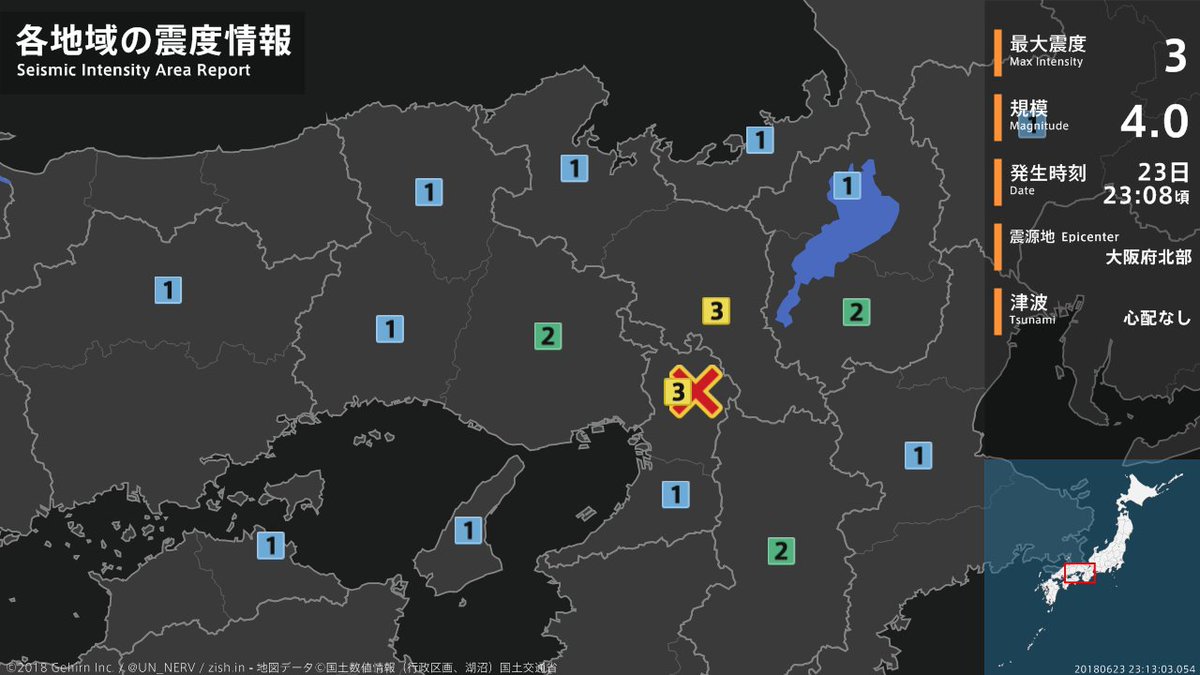 【地震情報 2018年6月23日】 23時08分頃、大阪府北部を震源とする地震がありました。震源の深さは約10km、地震の規模はM4