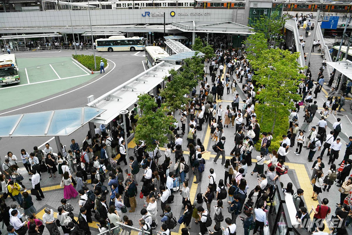 【大阪府北部で震度6弱】梅田のJR大阪駅では停止した列車から乗客がホームに歩く姿が見られました。電車の運転見合わせによりバス乗り場が混雑しています=目良友樹撮影