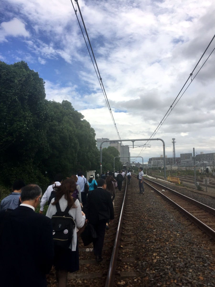 大阪府北部・茨木市などで震度6弱の地震発生被害写真まとめに写真を追加、大阪城公園駅の手前で停車した電車から脱出の様子など